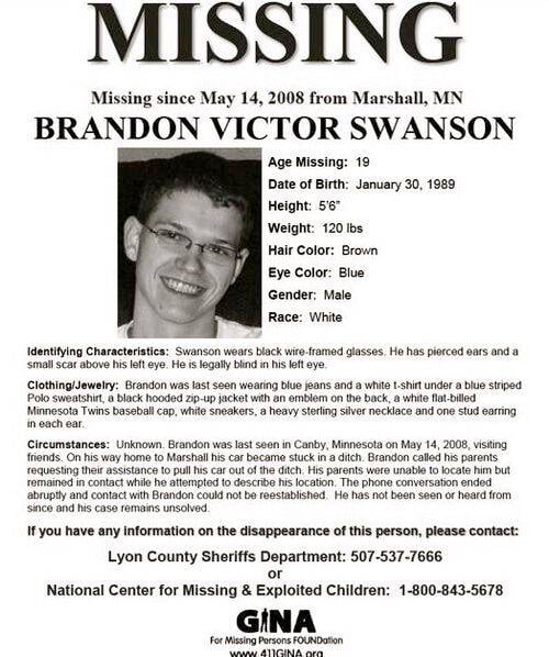 On May 13, 2008, Minnesota West Community and Technical College's academic year ended. To celebrate, Brandon attended two parties his friends had thrown. The first party Swanson attended was in Lynd, Minnesota, 7 miles away from his home in Marshall. Brandon left the party to attend another party, a drive 40 minutes away from Lynd in Canby, Minnesota, the last sighting of Swanson.