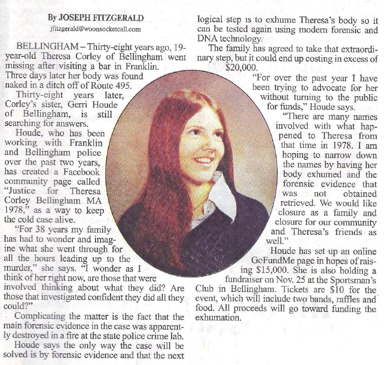 If you have any information on the unsolved murder of Theresa Corley, please contact the Bellingham Police tip line at 508-657-2863, or the Franklin Police tip line at 508-440-2780 or tips@franklinpolice.com, or the Norfolk County District Attorney’s tip line at 617-593-8840.